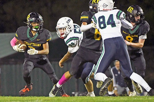 Rogue River's Gianni Gervasi (left) looks for space as he embarks on a long touchdown run in the first quarter, Gervasi's second TD of the period, on Friday night at Chieftain Stadium. The Chieftains defeated the Crusaders 65-42.