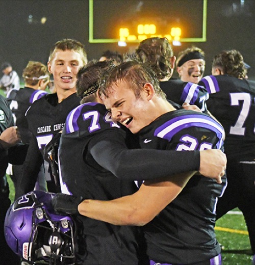 Cascade Christian teammates Rowan Erickson (right) and Tucker Mayben (left) embrace after the Challengers defeated Burns 35-28 to win the Class 3A football state championship Saturday night at Summit High School in Bend.